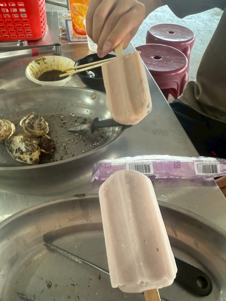 而且,店家不時還會準備一些小驚喜。像我這次去,剛好遇到端午連假,老闆就大方地送上古早味冰棒,烤完熱呼呼的蚵仔,來一根冰棒,真的是透心涼,也讓這次的用餐體驗更加分。