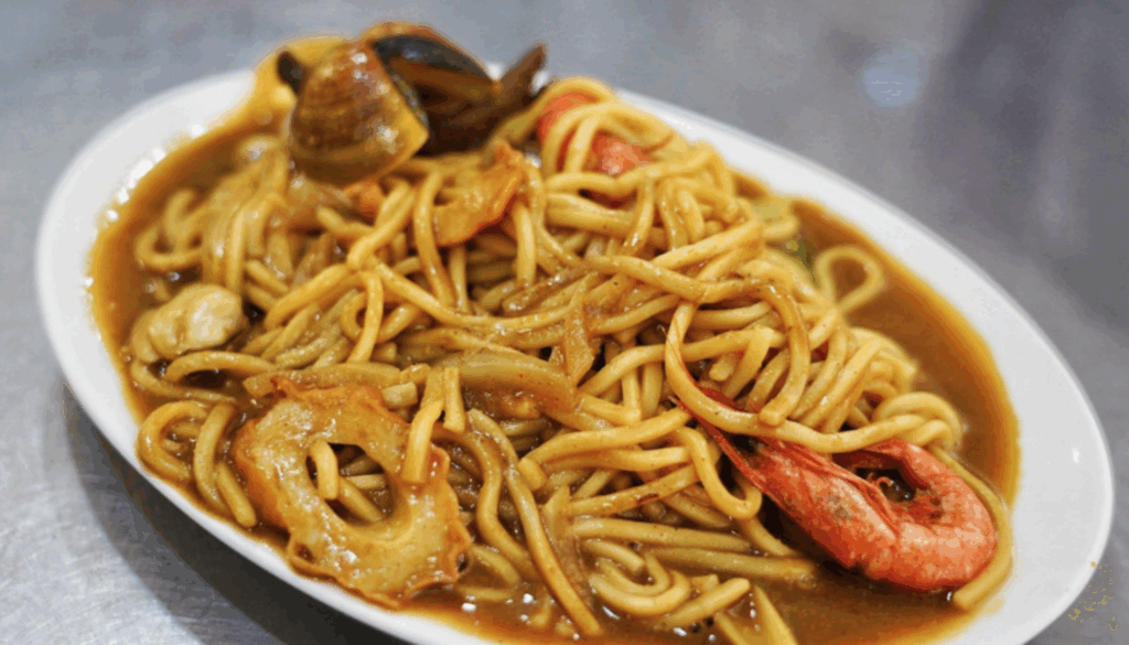 我點了店內人氣最高的「什錦咖哩炒麵」,一上桌,份量十足,視覺效果就先加分!油麵被濃郁的咖哩醬汁包裹得閃閃發亮,配料更是豐富到不行:蝦子、蛤蜊、豬肝、豬肉片、洋蔥、小白菜,還有基隆特產吉古拉,滿滿一盤,誠意十足。