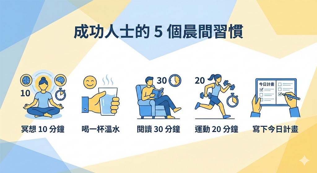 請用「扁平插畫」風格,製作一張關於「成功人士的 5 個晨間習慣」的資訊圖表。內容包含:1. 冥想 10 分鐘、2. 喝一杯溫水、3. 閱讀 30 分鐘、4. 運動 20 分鐘、5. 寫下今日計畫。請用圖示搭配繁體中文標題,整體色調使用藍色與黃色。