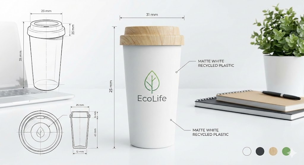 請生成一張環保隨行杯的產品設計圖。杯身為霧面白色,材質為再生塑料。杯蓋是淺木紋色。杯身中間有一個簡約的綠色葉子 Logo,下方印有「EcoLife」字樣。背景請設定在一個乾淨明亮的辦公桌上。
