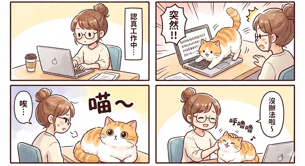 請用可愛的日系四格漫畫風格,繪製一個關於貓咪打斷主人在家工作的故事。第一格:主人在電腦前認真工作。第二格:貓咪跳上桌子,趴在鍵盤上。第三格:主人無奈地看著貓咪,貓咪發出「喵~」的叫聲。第四格:主人放棄工作,開始摸貓。對話請使用繁體中文。